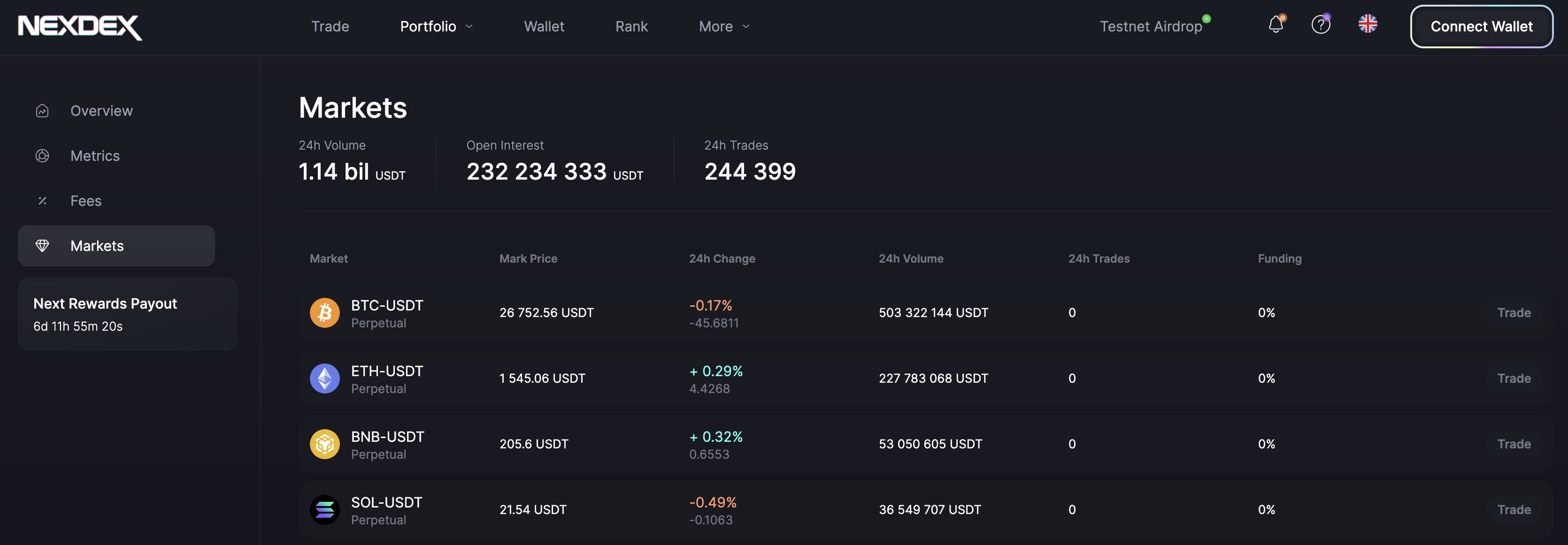 Go to the Portfolio -> Markets section to see the overall statistics on trading volume, the number of trades, open interest, and the list of all available markets:
